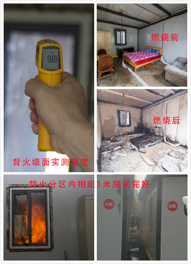 此次实验采用了HMG预制装配式防火板房。实验数据显示:点火房间内最高温度达到956℃,持续燃烧28分钟后自然熄灭,房间内温度下降至180℃;背火墙面最高温度100℃;火势未蔓延至毗邻房间。本次实验还进行了新型纳米防火涂料的实体火灾试验,验证了新型纳米防火涂料的优良性能。